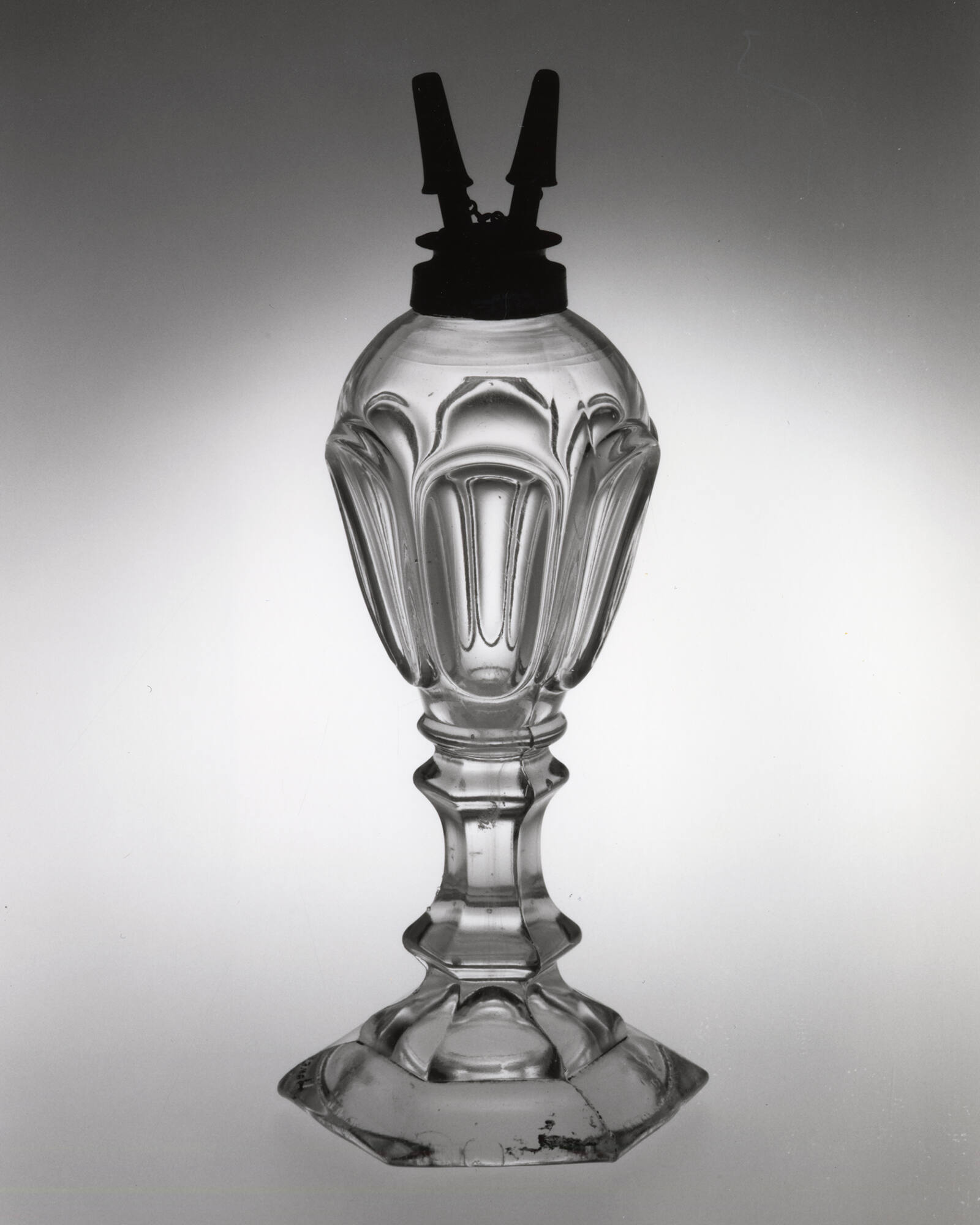 DescriptionEntire piece pressed upright in a female mold of three vertical sections that formed the hexagonal font with six loops, standard, and base, by a plain male plunger that formed the interior of the font, in conjunction with a plain male plunger, or plug, that formed the interior of the base. Moldmarks extend from the underside of the foot up to the collar. Upper part of font reheated and tooled to form the domed top and lip for the collar. Pewter collar fitted with a pewter-and-brass double-wick burner for burning fluid, with caps. Rough edge on underside of perimeter of base may be from a pontil. Underside of base not ground.
