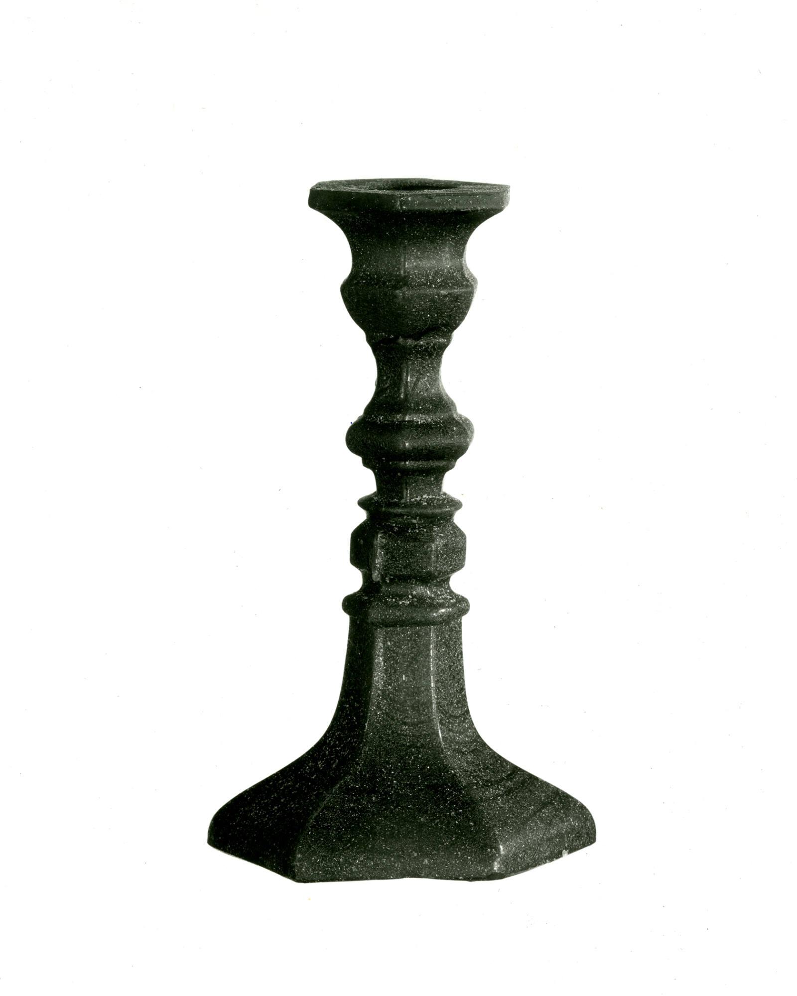 DescriptionSocket and stem pressed upright in a female mold of two vertical sections by a plain male plunger that also formed the top of the socket. Joined by a wafer to a hexagonal base. Base pressed upside down in a female mold of two vertical sections by a plain male plunger, with a cap ring that formed the underside of the edge of the base and the slightly angled shoulder above the edge of the base. Rough pontil mark on underside of inner edge of base.