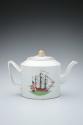 DescriptionDrum shape porcelain teapot with ribbon handle. Decorated in polychrome, front and reverse with a ship flying the American flag.