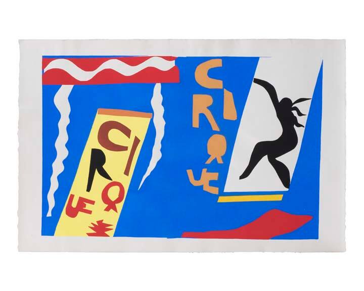 Label TextWhen Henri Matisse took up a proposal to make an album in color, he was seriously ill following cancer surgery and deeply disturbed by European events. Nevertheless, in 1943-44, working in vividly-hued cut paper, he created twenty collages from which the stenciled prints were made. Initially entitled The Circus, these images, as Matisse wrote, "have resulted from the crystallizations of memories of the circus, popular tales, or of travel." Here, he depicted the Codomas brothers, celebrated trapezists of decades before, executing their dangerous maneuvers above the net. In his text for Jazz, Matisse described his technique as "Drawing with scissors: Cutting directly into color." Late in life, he found new ways to resolve what he called "the eternal conflict of drawing and color." The subject here is a female swimmer watched by a red-faced man, a spectacle he recalled from a Parisian music hall. Like The Codomas nearby, Matisse's image parallels his accompanying text musing on airplane travel, on "the perception of limitless space in which for a moment we felt so free." “Drawing with scissors—cutting directly into vivid color reminds me of the direct carving of the sculptor on stone. My book has emerged from this spirit.” (Henri Matisse, Jazz) Henri Matisse first cut shapes in color paper in 1931–33 to create the design layout of his mural The Dance. It was a method he would continue to explore for the rest of his career. In 1943, at the publisher Tériade’s suggestion, Matisse began working on cutouts for a book. Unable to get the color he was looking for in commercial paper, he painted white paper with gouache (opaque watercolor). He then cut out the shapes and pinned them up on the wall of his studio, rearranging them until he was satisfied with the composition. Lithography did not reproduce the vivid colors of the painted paper satisfactorily, so Matisse decided on the pochoir technique, in which thick ink was applied with brushes through stencils. The book contains a facsimile handwritten text by Matisse that explores the artist’s thoughts on art and life. Jazz, however, was also issued as a portfolio of prints without text. Because the printing of this portfolio better captured Matisse’s color designs, it is the portfolio that Walter Bareiss collected.Published Referencescf. Castleman, Riva, A Century of Artists Books, New York, 1994, pp. 96--97, col. reprs.