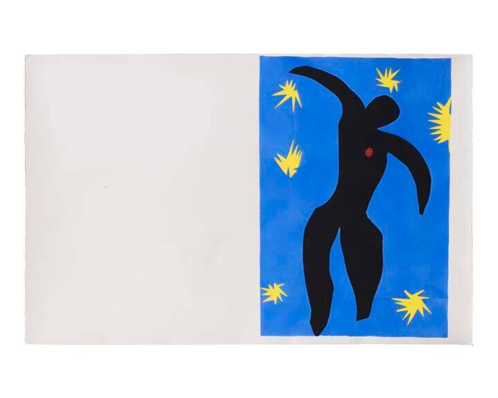 Label TextWhen Henri Matisse took up a proposal to make an album in color, he was seriously ill following cancer surgery and deeply disturbed by European events. Nevertheless, in 1943-44, working in vividly-hued cut paper, he created twenty collages from which the stenciled prints were made. Initially entitled The Circus, these images, as Matisse wrote, "have resulted from the crystallizations of memories of the circus, popular tales, or of travel." Here, he depicted the Codomas brothers, celebrated trapezists of decades before, executing their dangerous maneuvers above the net. In his text for Jazz, Matisse described his technique as "Drawing with scissors: Cutting directly into color." Late in life, he found new ways to resolve what he called "the eternal conflict of drawing and color." The subject here is a female swimmer watched by a red-faced man, a spectacle he recalled from a Parisian music hall. Like The Codomas nearby, Matisse's image parallels his accompanying text musing on airplane travel, on "the perception of limitless space in which for a moment we felt so free." “Drawing with scissors—cutting directly into vivid color reminds me of the direct carving of the sculptor on stone. My book has emerged from this spirit.” (Henri Matisse, Jazz) Henri Matisse first cut shapes in color paper in 1931–33 to create the design layout of his mural The Dance. It was a method he would continue to explore for the rest of his career. In 1943, at the publisher Tériade’s suggestion, Matisse began working on cutouts for a book. Unable to get the color he was looking for in commercial paper, he painted white paper with gouache (opaque watercolor). He then cut out the shapes and pinned them up on the wall of his studio, rearranging them until he was satisfied with the composition. Lithography did not reproduce the vivid colors of the painted paper satisfactorily, so Matisse decided on the pochoir technique, in which thick ink was applied with brushes through stencils. The book contains a facsimile handwritten text by Matisse that explores the artist’s thoughts on art and life. Jazz, however, was also issued as a portfolio of prints without text. Because the printing of this portfolio better captured Matisse’s color designs, it is the portfolio that Walter Bareiss collected.Published Referencescf. Castleman, Riva, A Century of Artists Books, New York, 1994, pp. 96--97, col. reprs.