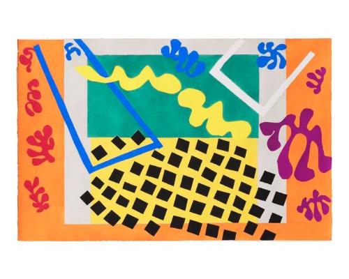 Label TextWhen Henri Matisse took up a proposal to make an album in color, he was seriously ill following cancer surgery and deeply disturbed by European events. Nevertheless, in 1943-44, working in vividly-hued cut paper, he created twenty collages from which the stenciled prints were made. Initially entitled The Circus, these images, as Matisse wrote, "have resulted from the crystallizations of memories of the circus, popular tales, or of travel." Here, he depicted the Codomas brothers, celebrated trapezists of decades before, executing their dangerous maneuvers above the net. In his text for Jazz, Matisse described his technique as "Drawing with scissors: Cutting directly into color." Late in life, he found new ways to resolve what he called "the eternal conflict of drawing and color." The subject here is a female swimmer watched by a red-faced man, a spectacle he recalled from a Parisian music hall. Like The Codomas nearby, Matisse's image parallels his accompanying text musing on airplane travel, on "the perception of limitless space in which for a moment we felt so free." “Drawing with scissors—cutting directly into vivid color reminds me of the direct carving of the sculptor on stone. My book has emerged from this spirit.” (Henri Matisse, Jazz) Henri Matisse first cut shapes in color paper in 1931–33 to create the design layout of his mural The Dance. It was a method he would continue to explore for the rest of his career. In 1943, at the publisher Tériade’s suggestion, Matisse began working on cutouts for a book. Unable to get the color he was looking for in commercial paper, he painted white paper with gouache (opaque watercolor). He then cut out the shapes and pinned them up on the wall of his studio, rearranging them until he was satisfied with the composition. Lithography did not reproduce the vivid colors of the painted paper satisfactorily, so Matisse decided on the pochoir technique, in which thick ink was applied with brushes through stencils. The book contains a facsimile handwritten text by Matisse that explores the artist’s thoughts on art and life. Jazz, however, was also issued as a portfolio of prints without text. Because the printing of this portfolio better captured Matisse’s color designs, it is the portfolio that Walter Bareiss collected.Published Referencescf. Castleman, Riva, A Century of Artists Books, New York, 1994, pp. 96--97, col. reprs.