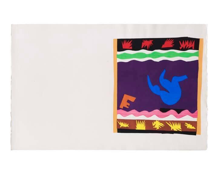 Label TextWhen Henri Matisse took up a proposal to make an album in color, he was seriously ill following cancer surgery and deeply disturbed by European events. Nevertheless, in 1943-44, working in vividly-hued cut paper, he created twenty collages from which the stenciled prints were made. Initially entitled The Circus, these images, as Matisse wrote, "have resulted from the crystallizations of memories of the circus, popular tales, or of travel." Here, he depicted the Codomas brothers, celebrated trapezists of decades before, executing their dangerous maneuvers above the net. In his text for Jazz, Matisse described his technique as "Drawing with scissors: Cutting directly into color." Late in life, he found new ways to resolve what he called "the eternal conflict of drawing and color." The subject here is a female swimmer watched by a red-faced man, a spectacle he recalled from a Parisian music hall. Like The Codomas nearby, Matisse's image parallels his accompanying text musing on airplane travel, on "the perception of limitless space in which for a moment we felt so free." “Drawing with scissors—cutting directly into vivid color reminds me of the direct carving of the sculptor on stone. My book has emerged from this spirit.” (Henri Matisse, Jazz) Henri Matisse first cut shapes in color paper in 1931–33 to create the design layout of his mural The Dance. It was a method he would continue to explore for the rest of his career. In 1943, at the publisher Tériade’s suggestion, Matisse began working on cutouts for a book. Unable to get the color he was looking for in commercial paper, he painted white paper with gouache (opaque watercolor). He then cut out the shapes and pinned them up on the wall of his studio, rearranging them until he was satisfied with the composition. Lithography did not reproduce the vivid colors of the painted paper satisfactorily, so Matisse decided on the pochoir technique, in which thick ink was applied with brushes through stencils. The book contains a facsimile handwritten text by Matisse that explores the artist’s thoughts on art and life. Jazz, however, was also issued as a portfolio of prints without text. Because the printing of this portfolio better captured Matisse’s color designs, it is the portfolio that Walter Bareiss collected.Published Referencescf. Castleman, Riva, A Century of Artists Books, New York, 1994, pp. 96--97, col. reprs.