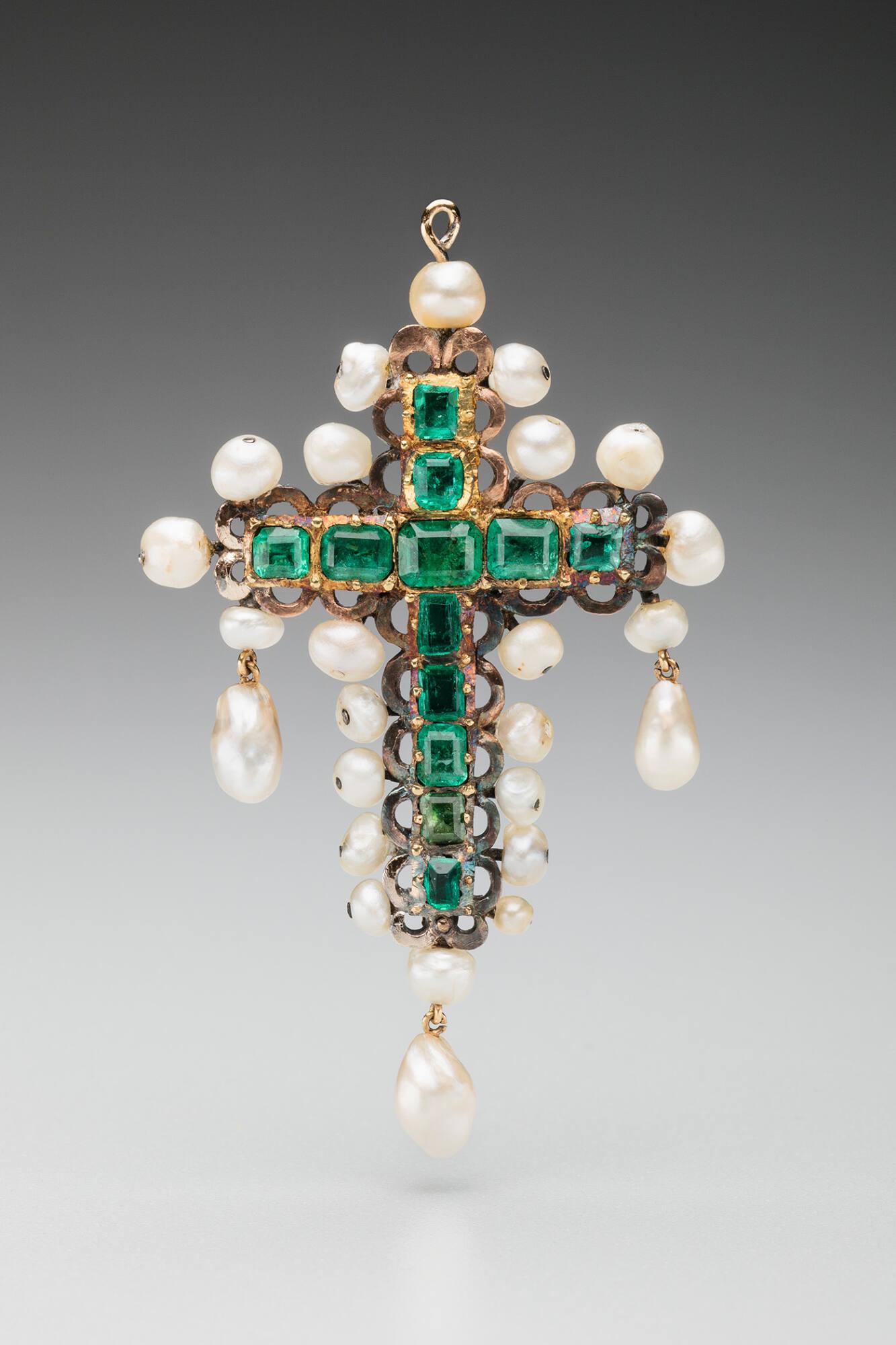 MediumComposed of 13 square-cut Colombian emeralds (1 replaced), set in gold and surrounded by natural pearls.