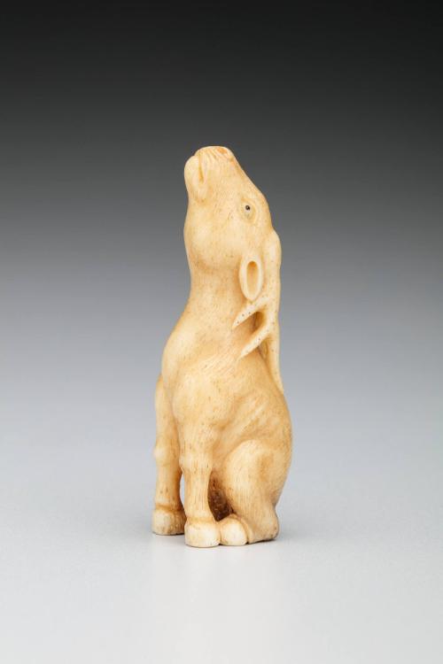 DescriptionNetsuke in the shape of a seated kirin, a mythological hooved creature.