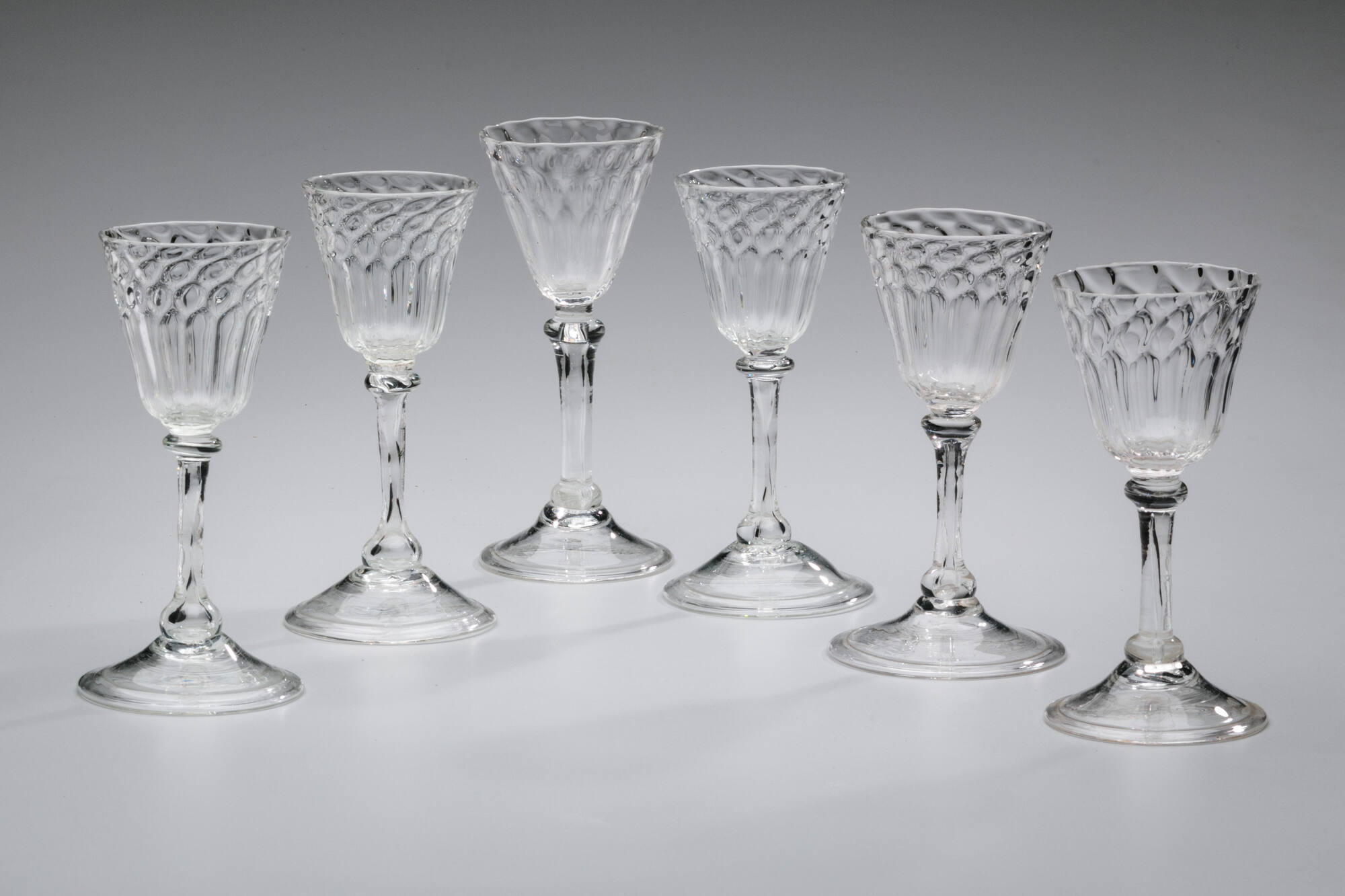 DescriptionA set of 6 nearly identical verre de fougere wine glasses. The glasses feature a slightly domed base with the foot rim folded up, and a slender columnar stem attached by small pads to the stem and a truncated, conical pattern-molded bowl with two rows of impressed circles, a third row drawn out towards the stem to form vertical flutes. The glasses are transparent with a slight green tinge due to the addition of fern ash to the batch.