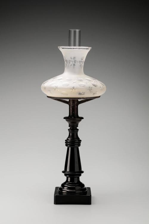 DescriptionThe Black-Amethyst Sinumbra Lamp features a pressed glass plinth base that leads to a blown classical revival column stem which is hollow and has air-intake holes. A ring-shaped brass cream-colored painted metal ring-shaped font with filler hole, the Argand burner, is attached to the glass base with plaster. The shade, with its outer surface roughened by grinding and a design of flowers and leaves cut through the roughening, rests on the metal font. The chimney is blown of clear glass and extends beyond the top of the shade.