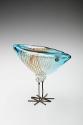 DescriptionThe two stylized birds are blown and tooled of transparent blue glass with gilded copper wire feet and legs. One bird is of drop shape, its beak pointing up, wings tooled backwards, with a translucent band of mosaic cane sections around its lower body and opaque mosaic cane eyes. The second bird is of horizontal pod shape, its back flattened on top and encircled around its belly with a thin orange trail, and opaque mosaic cane sections as eyes.