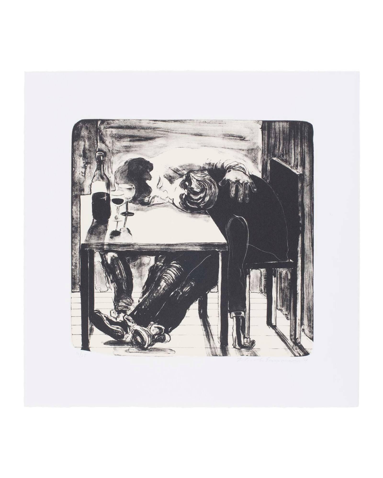 DescriptionKnown for her emotive works deeply rooted in art history’s visual language, Nicole Eisenman ceased painting in 2012 to devote herself entirely to printmaking for eight months. The lithographs she created during this period, such as Sloppy Barroom Kiss, combine her exploration of current popular culture with the style and innovative printmaking techniques developed by German Expressionist artists such as Edvard Munch and Max Beckmann. Here, Eisenman’s homage to Munch effectively translates his themes of death and sexuality into a comedic scene of night drinking in a NYC hipster bar and fits into her larger body of work that explores bar encounters and dinner scenes.