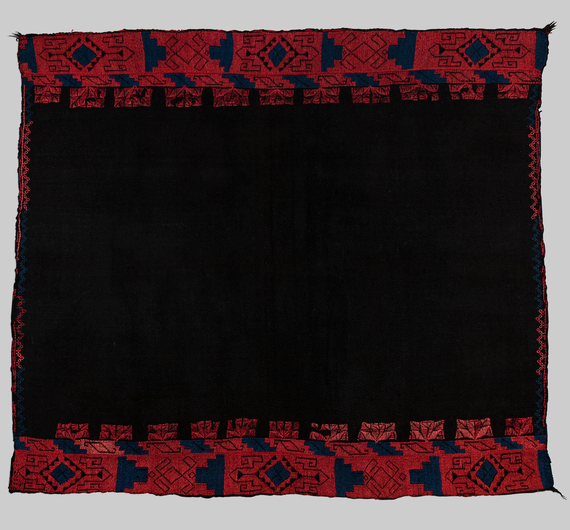 Label TextThis textile, known as a “manta,” is a woman’s shawl from the Acoma Pueblo in New Mexico. Embroidered Acoma mantas are generally considered to be the rarest category of Pueblo wearing blankets. Only approximately 35 historical embroidered Acoma mantas exist in museums and private hands. The embroidered designs on the manta combine Spanish floral motifs with design elements from the Ancestral Puebloans, or Anasazi. Contained in the pattern of the manta’s border are abstracted depictions of parrots and water bugs, both of which have a special meaning to the Acoma tribe. Pueblo weaving was completed by the men of the community on a standing, vertical loom. The textile is woven using a diagonal twill float weave where both warp and weft are visible. The wool was spun with precision, with the deep brown color carded from belly wool. Indigo was used to dye lighter wool blue for the decorative motifs. The red pigment on this manta comes from lac dye, which derives from the resin and wax secretion of the lac insect.20th century