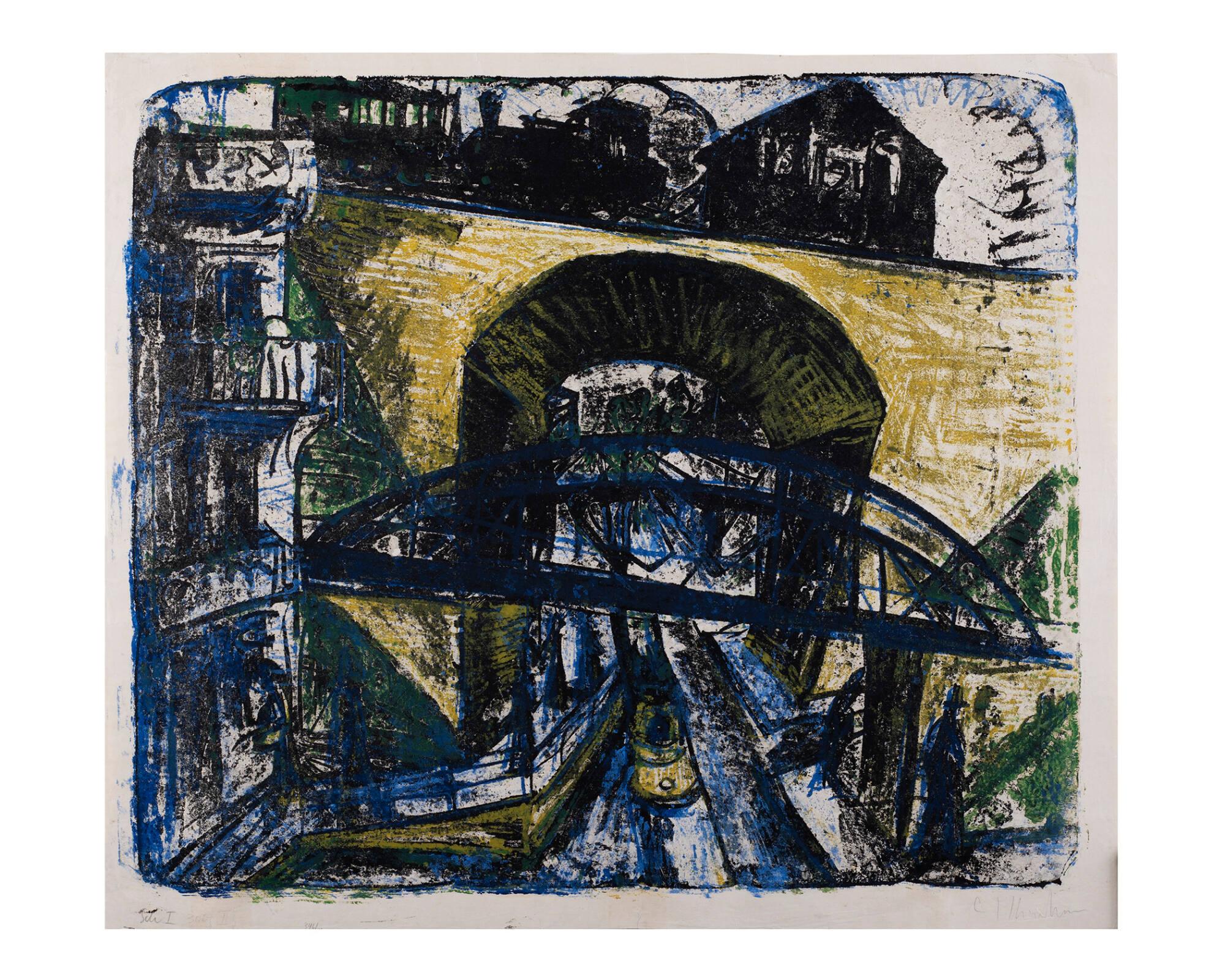DescriptionAmong Kirchner’s finest, this large, 4-color lithograph, Tramway Arch, belongs to his most productive and innovative artistic period. Created as part of his famous Berlin city scenes, this complex image with its jarring colors, sharply tilted perspective, and gestural lines, powerfully captures the mechanized dynamism and energy of the rapidly growing Berlin metropolis. Dominating the composition is a massive, stone archway that rises behind a steel bridge and is framed by an isolated apartment building. Above, a rail train passes by a house, as a tram (trolley car) emerges below from beneath the criss-crossing structures and thoroughfares. Countering these machine-driven modes of transportation are scurrying, anonymous pedestrians who make their way along either side of the embankment.