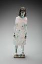 DescriptionStanding female figure of cast glass and ceramic on small plinth. Figure is wearing short sleeve white dress that has open-work pattern to create a lace effect.