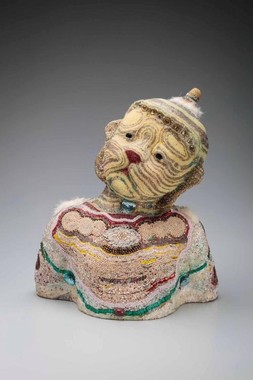 Label TextTrained in both printmaking and ceramics, Sherry Markovitz began to use glass beads and other mixed media in her work in the 1980s to create powerfully symbolic works. Often taking the form of animal heads, her ornately decorated busts are meant to represent, in part, rebirth. Markovitz takes inspiration from non-Western visual traditions found in folk, ethnic, and tribal art forms and imbues her objects with a cross-cultural sensibility through the use of beads, which are used for adornment in many countries. In Breasted Buddha, she focuses her attention on Buddhism, specifically the lesser known female Buddhas. This interpretation of the Buddha with its animal-like face and intricate beaded mandala patterns is incredibly complex, yet strangely serene in its presentation.Exhibition HistoryPullman, WA, Washington State University, Sherry Markovitz: Shimmer Paintings and Sculptures 1979-2007, February 22-April 12, 2008.