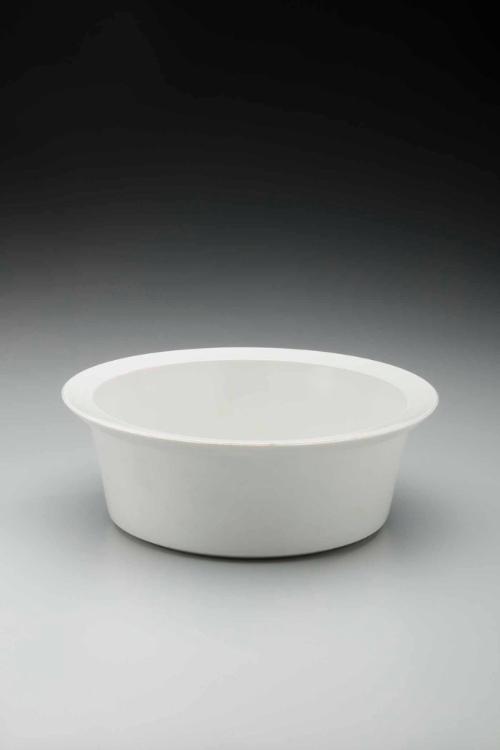 DescriptionWhite glass-ceramic prototype from the Serve Libbey Ware line. Circular in form, absent of handles and lid, the production prototype forms the basic structure of the Three Quart Saucepan, where painted design, handles and a glass lid are added.