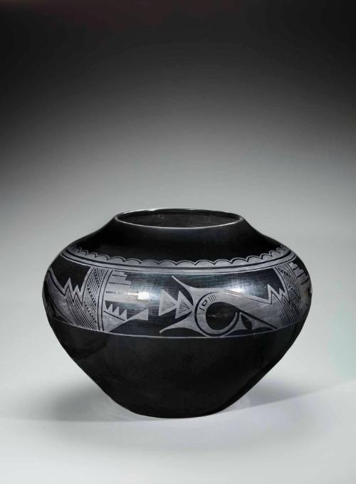 Label TextA matriarch of 20th-century Native American pottery, Maria Martinez is largely credited with having revived the ancient tradition of black on black pottery that remains popular to this day. At the time that it was revived, the style of blackware pottery that Martinez popularized stood in notable contrast to the all-red or polychrome ware that had dominated the San Ildefonso Pueblo’s production for generations. This extraordinary example of Martinez’s work is notable for its nearly perfect symmetry and iconic painting, featuring a pattern that symbolizes a bird, rain, and thunderclouds. Maria said of her work, “I just thank God because [my work is] not only for me; it’s for all the people. I said to my God, the Great Spirit, Mother Earth gave me this luck. So I’m not going to keep it.” In keeping with Puebloan tradition of women as potters and men as painters, Maria’s husband Julian painted the design on the jar. The jar is signed “Marie and Julian” on the bottom, indicating that it was created after the mid-1920s when Martinez began to sign her pots for market purposes. This practice was not part of the pottery-making traditions of the Pueblo.Published ReferencesMarriott, Alice L., María, the Potter of San Ildefonso, Norman, University of Oklahoma Press, 1948, repr. p. 261.