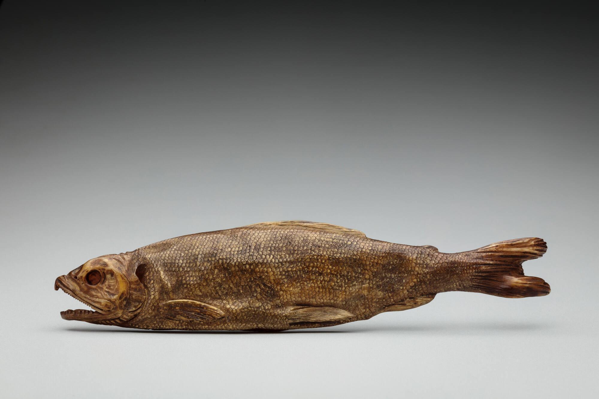 DescriptionSashi style elongated netsuke of a Horimono (dried salmon fish)