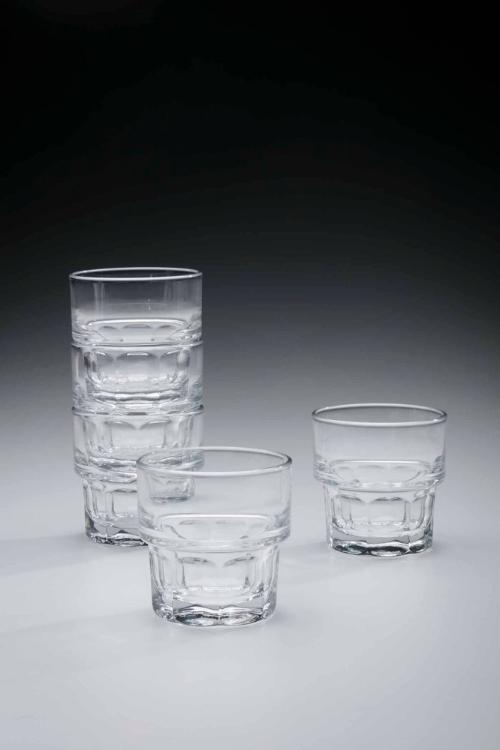 DescriptionFive short stackable tumblers for the bar. Advertised by Libbey as "Stacks for Life:Glassware for professionals." These tumblers have Libbey's Duratuff treatment, a strengthening thermal after-process, which allows the tumblers to be stacked without surface damage.