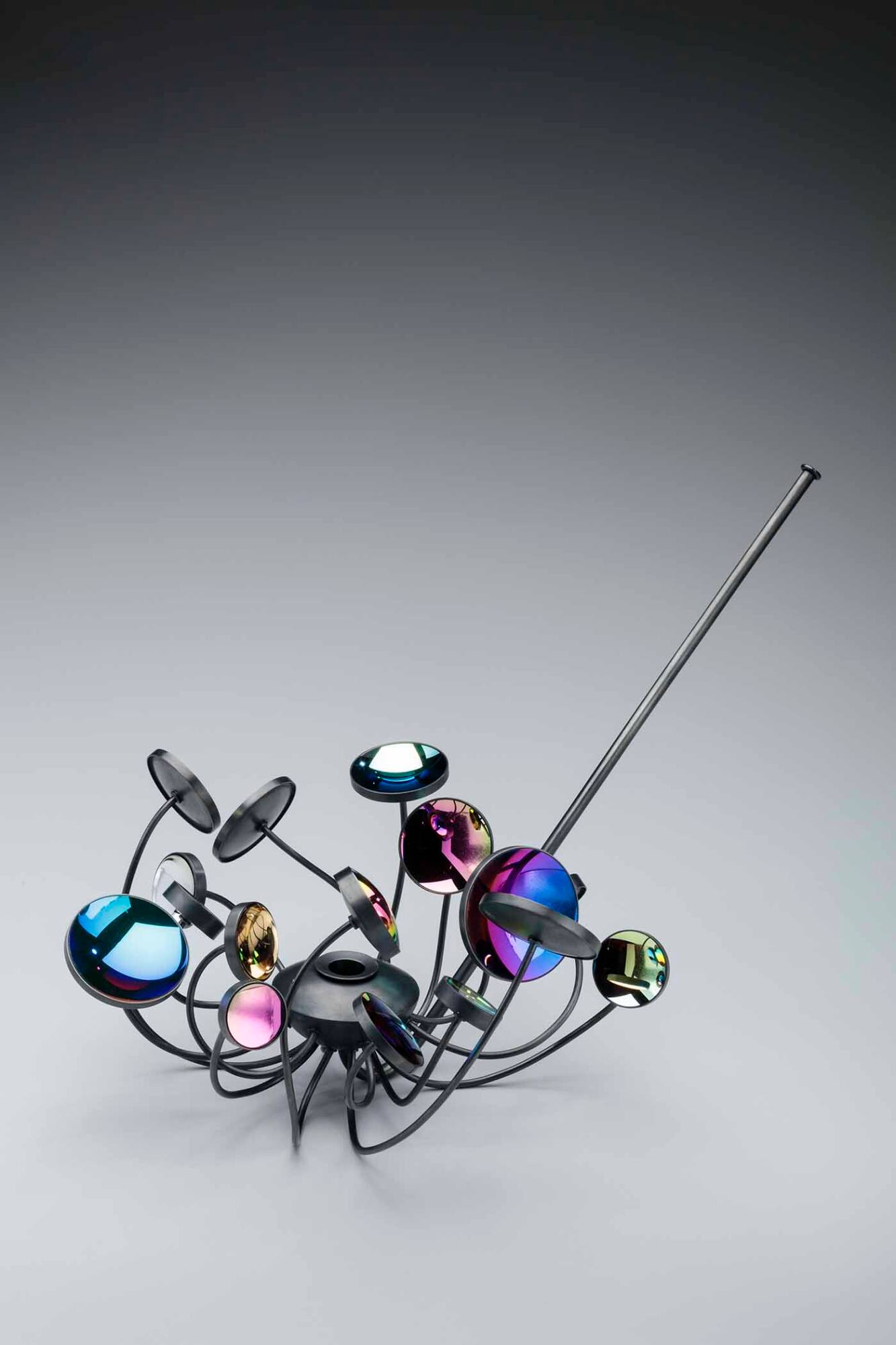 DescriptionBlackened, oxidized silver pipe with a long pipe stem attached to a rounded base with removable pipe bowl. Issuing from the base in different orientations are 16 long stems of blackened silver with disc-shaped mounts set with brilliant, reflective camera lenses with applied multi-colored PVD (physical vapor deposition) coatings.
