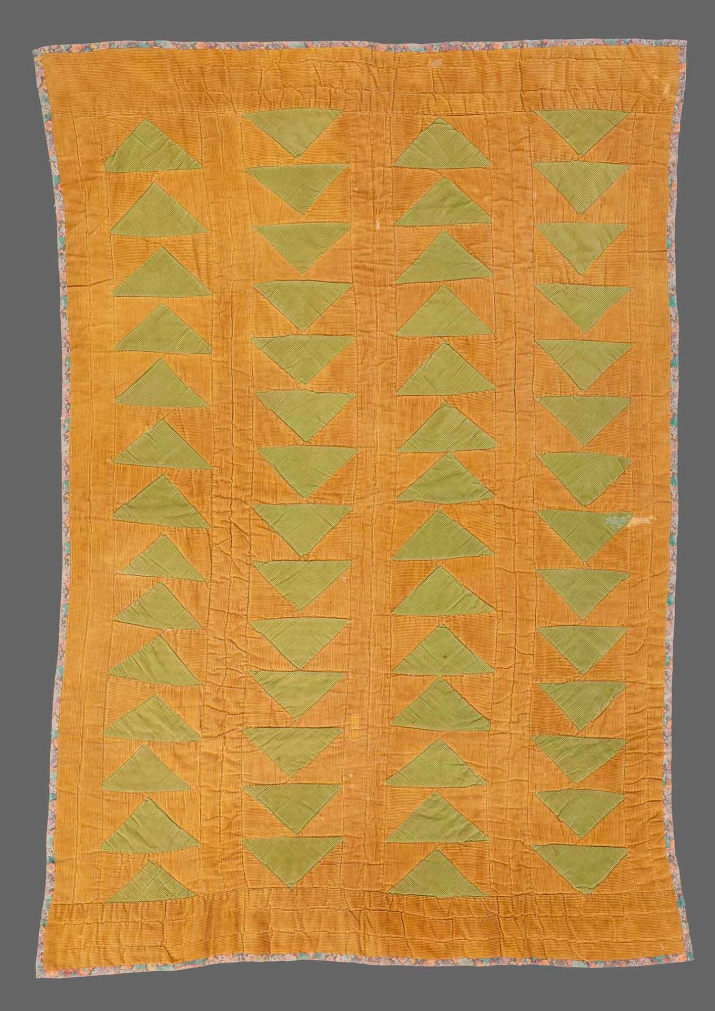 Description"Flying geese" is a long-established quilt pattern, inspired by the migratory patterns of birds. Folklore has it that escaped enslaved people would use encoded quilt patterns to help find their way to freedom along the Underground Railroad. This lore says that the "flying geese" pattern was a signal to follow the direction of the flying geese and other birds and they migrated north in the springtime. This pattern adopted a renewed significance during the Great Migration in the early to mid-twentieth century.