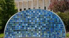 DescriptionA crescent moon shape comprised of dozens of pressed glass tiles of various shades of blue. The entire work is held in place by a stainless steel frame.