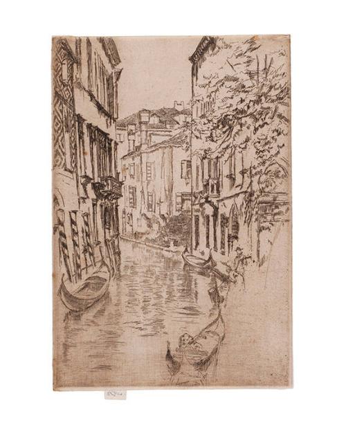 DescriptionThis scene is of the Fondamenta Sanudo with a corner of the Palazzo Soranzo-Venier-Sanudo-van Axel-Barozzi visible on the right. While the Palazzo was a favorite of artists, most notably Ruskin, Whistler took a different approach and focused on the canal. Five gondolas are moored along the landing and a pair of figures—a man and a woman— look into one of the boats on the right. A tree towers over the right side of the scene. One the left is a distinctively patterned three-story brick building with a gondola tied to iconic striped poles.