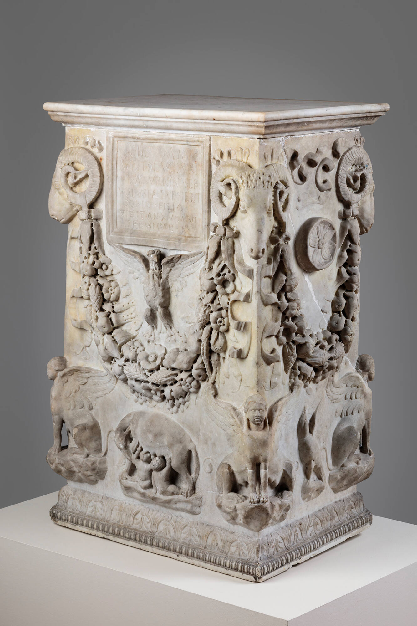 DescriptionA marble funerary altar featuring ram heads with garlands at the corners, crouching sphinxes below, and an eagle with outspread wings holding an inscription on the front. The side panels display a jug, bowl, and eagles, while the front showcases the Capitoline She-Wolf with Romulus and Remus.