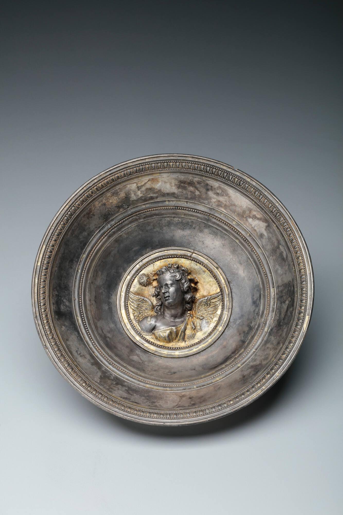 DescriptionThe bowl is formed from a single piece of hammered and raised silver. Its interior features chased and engraved concentric rings and a separately made central medallion soldered into place. The medallion displays a high-relief bust of a winged female figure adorned with a thyrsus and fawn-skin, with gilded accents applied by leaf method. Areas of the gilding are vertically striated, suggesting overlap of gold leaf. Multiple restorations include resin fills and retouched cracks, particularly around the roundel and facial features.