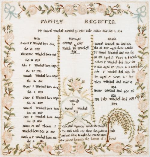 DescriptionFine woven linen gauze substrate embroidered with polychrome silk threads depicting the family register of Hannah Winchell. The work is bordered with a floral motif with embroidered blue ribbons in the top corners. There is a weeping willow tree in the lower right in the design field. This work was completed using a variety of stitches including cross stitch, stem stitch, satin stitch and french knots.