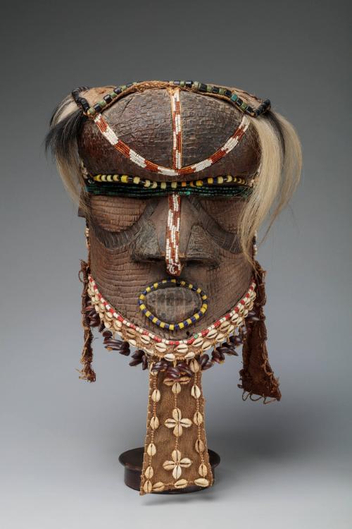 DescriptionLarge carved wood mask covered with leather and embellished with glass beads, fur, cowrie shells and seed pods variously placed along the lips, chin, jaw, forehead, brow line and crown.