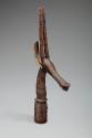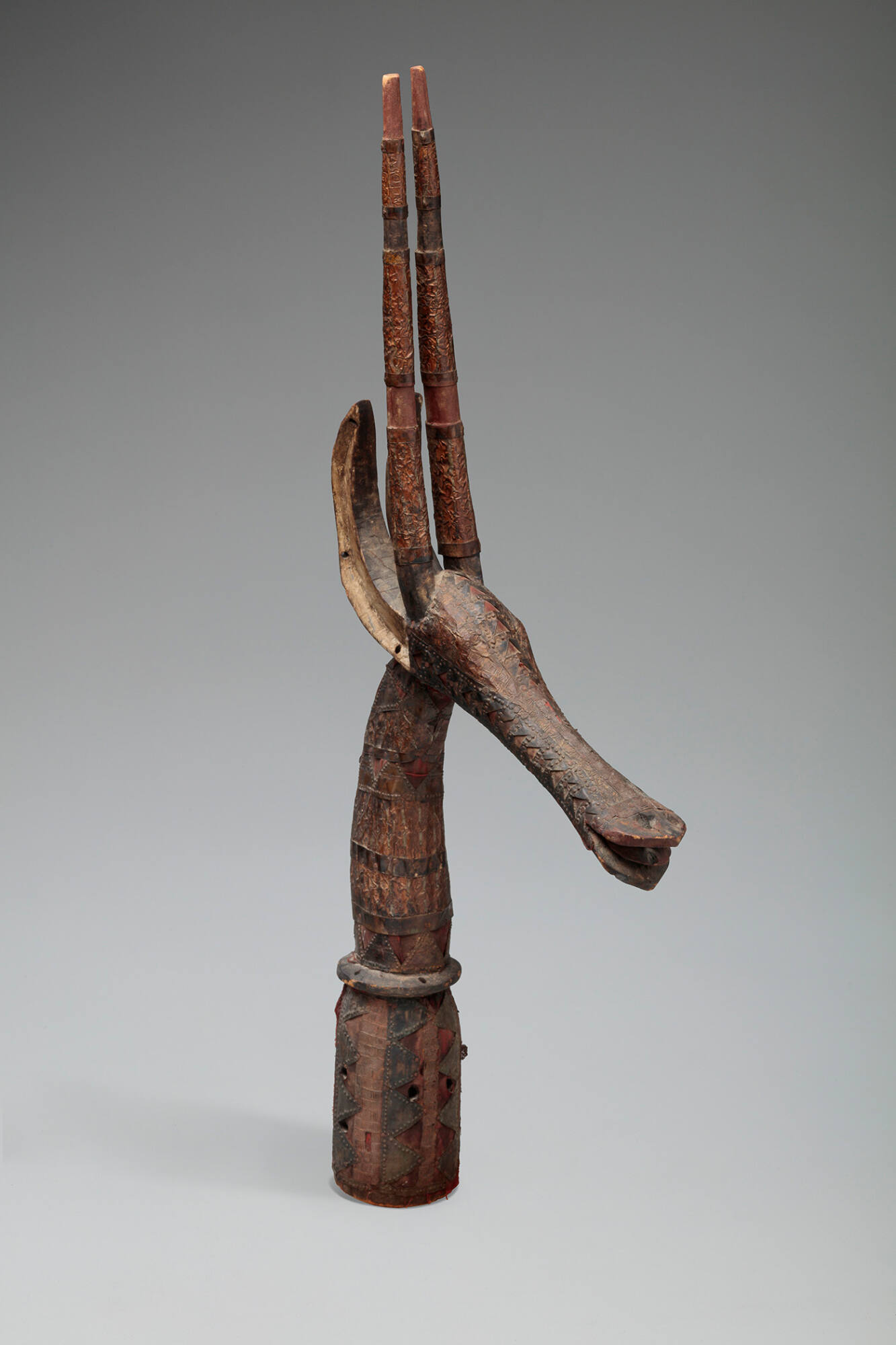 DescriptionLarge, slender wood mask carved in the form of an antelope with elongated perpendicular horns at the crown, an extended snout, and upturned curvilinear ears at the nape. The mask is nearly fully encased in decorative metal.