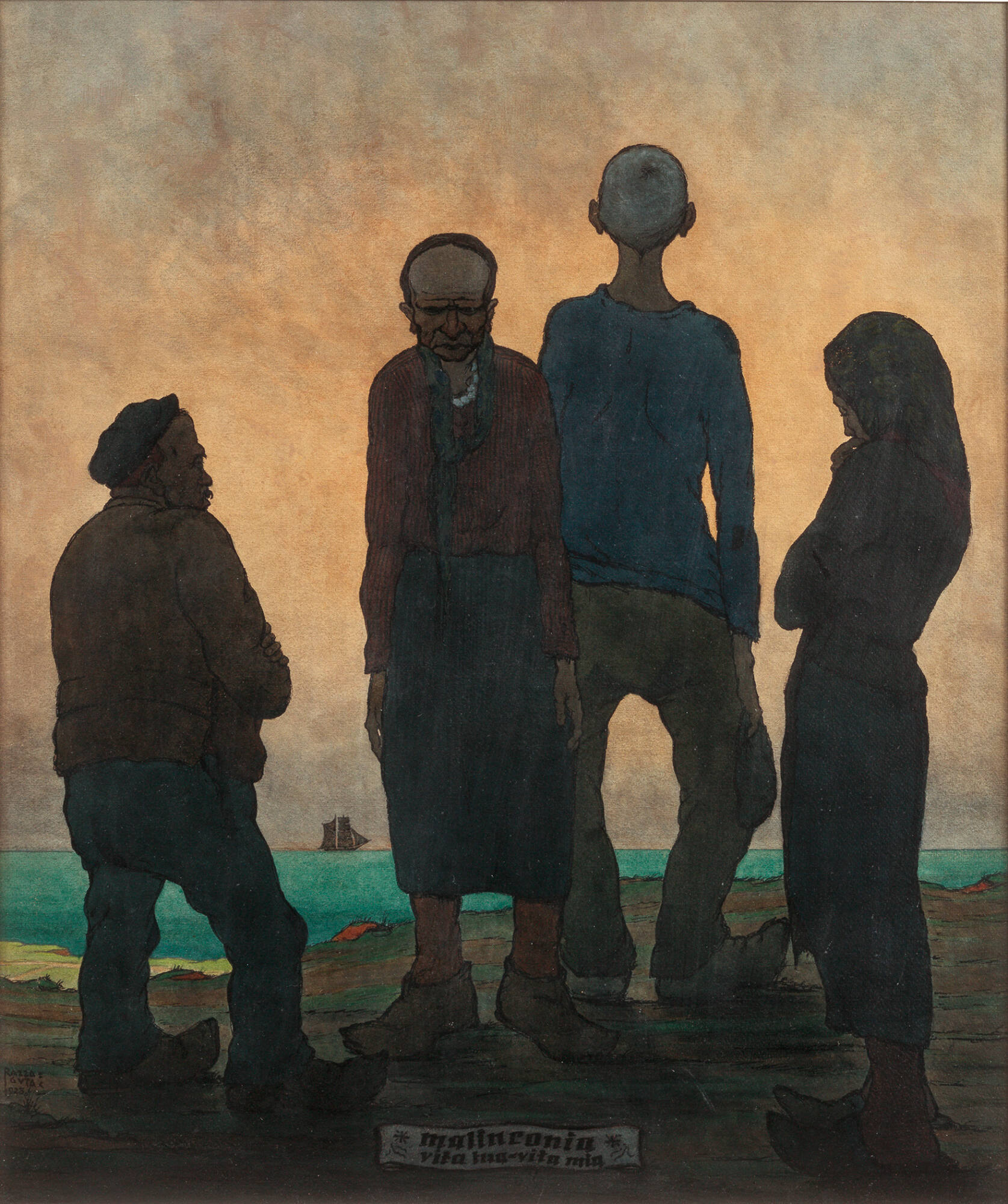 DescriptionThe work shows four figures near the cost. A ship can be seen on the water in the distance. One figure is looking out to sea, another is turned towards the viewer. Two figures left and right are seen in profile or semi-profile. Their clothes are simple and ill-fitting. The atmosphere is gloomy. The sun rises, or more likely sets, behind the figures in the distance. A banderole at center bottom carries the inscription: “malinconia / vita tua – vita mia”