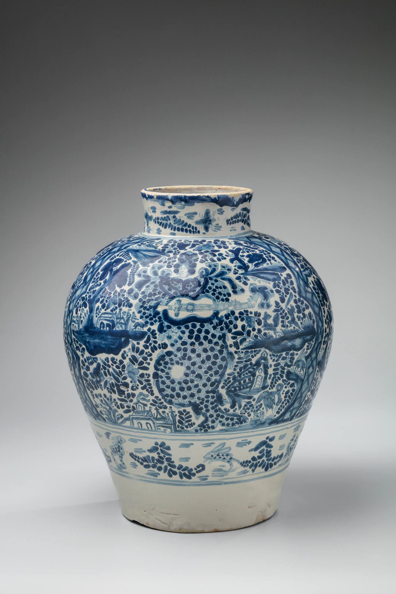 DescriptionA large, wide-shouldered vase with narrow neck and flat, footless base, with a surface treatment of blue and white glaze. It is decorated with a continuous frieze all around the main body of the vessel with a central figure of a mermaid in an elaborate headdress playing a guitar. The central figure of the mermaid is positioned amongst plumeado (feather) motifs in which can be seen buildings, trees, and animals such as jaguars and deer. The neck exhibits a separate band of decoration with foliage and insects. The base, likewise, is a separate band and illustrates a man with a club hunting various animals.