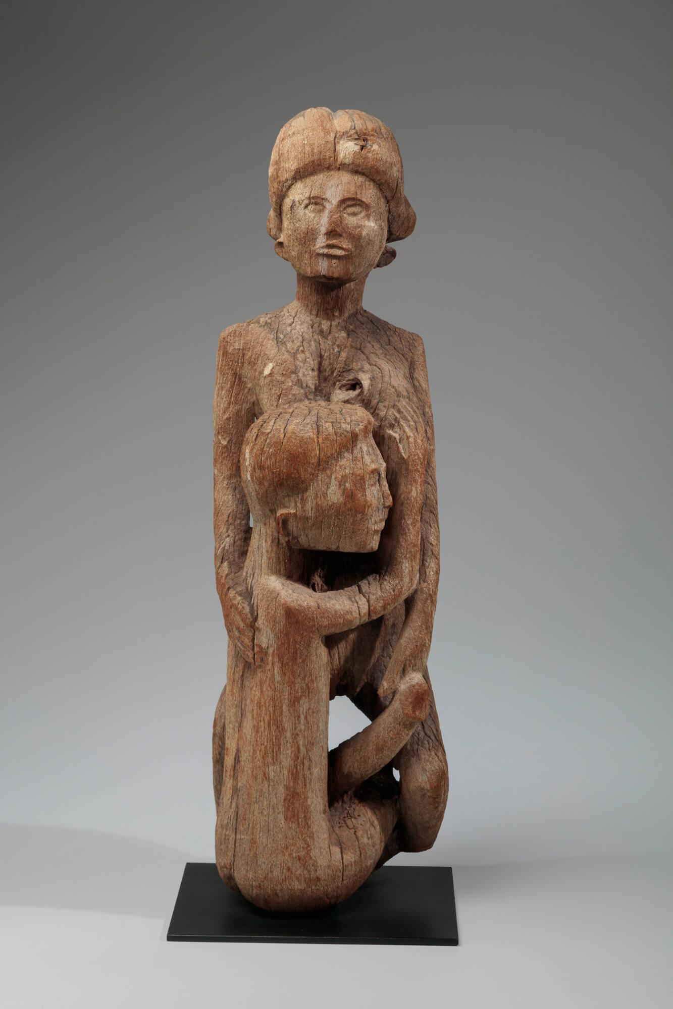 DescriptionWeathered wood sculpture of male and female couple in intimate embrace.
