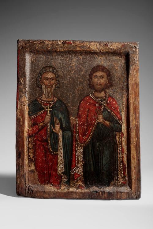 DescriptionThe panel depicts two male saints, with short beards and stern