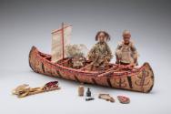 DescriptionThe model canoe is of classic form, with wood sheathing, ribs and crossbars, sewn with split roots and seams sealed with spruce gum, the exterior finely painted, in red, white, and black paint, with curvilinear designs and a series of dots outlining motifs, the male and female doll, each with modelled wax heads, arms and legs, wearing traditional costumes and accessories, the baby, in a fully appointed carrier; together with equipment including: a powder horn, tobaggon, a keg and a snowshoe.