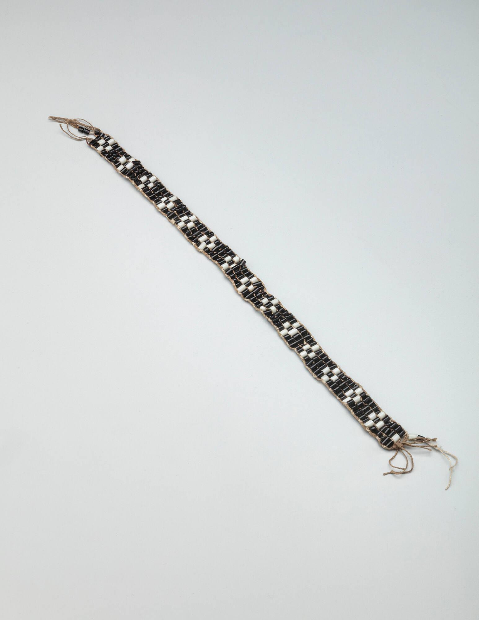 DescriptionThe piece is composed of black/deep purple and white tubular glass beads, interwoven on linen warps, in a series of three horizontal rows, with a frieze of terraced elements.