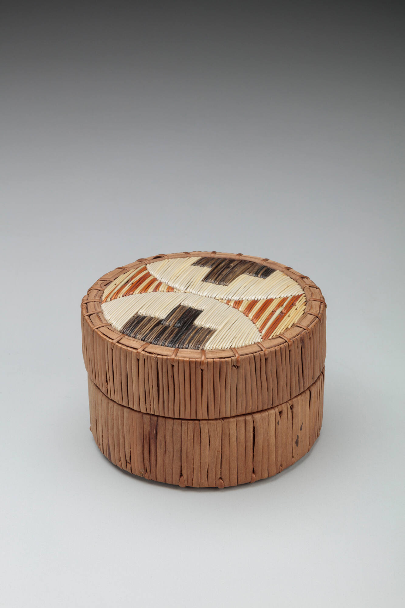DescriptionA Mi’kmaq quilled birchbark lidded container of circular form, decorated on the top with a quillwork section, in red, ivory and black, with two half-circles, each enclosing a stepped device, overlaying a striped ground.