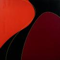 DescriptionAbstract painting comprised of two large color fields of orange and maroon. Black paint in-between these two fields and two neon-colored curved lines, one outlining the maroon section and the other bisecting the orange and black color fields.