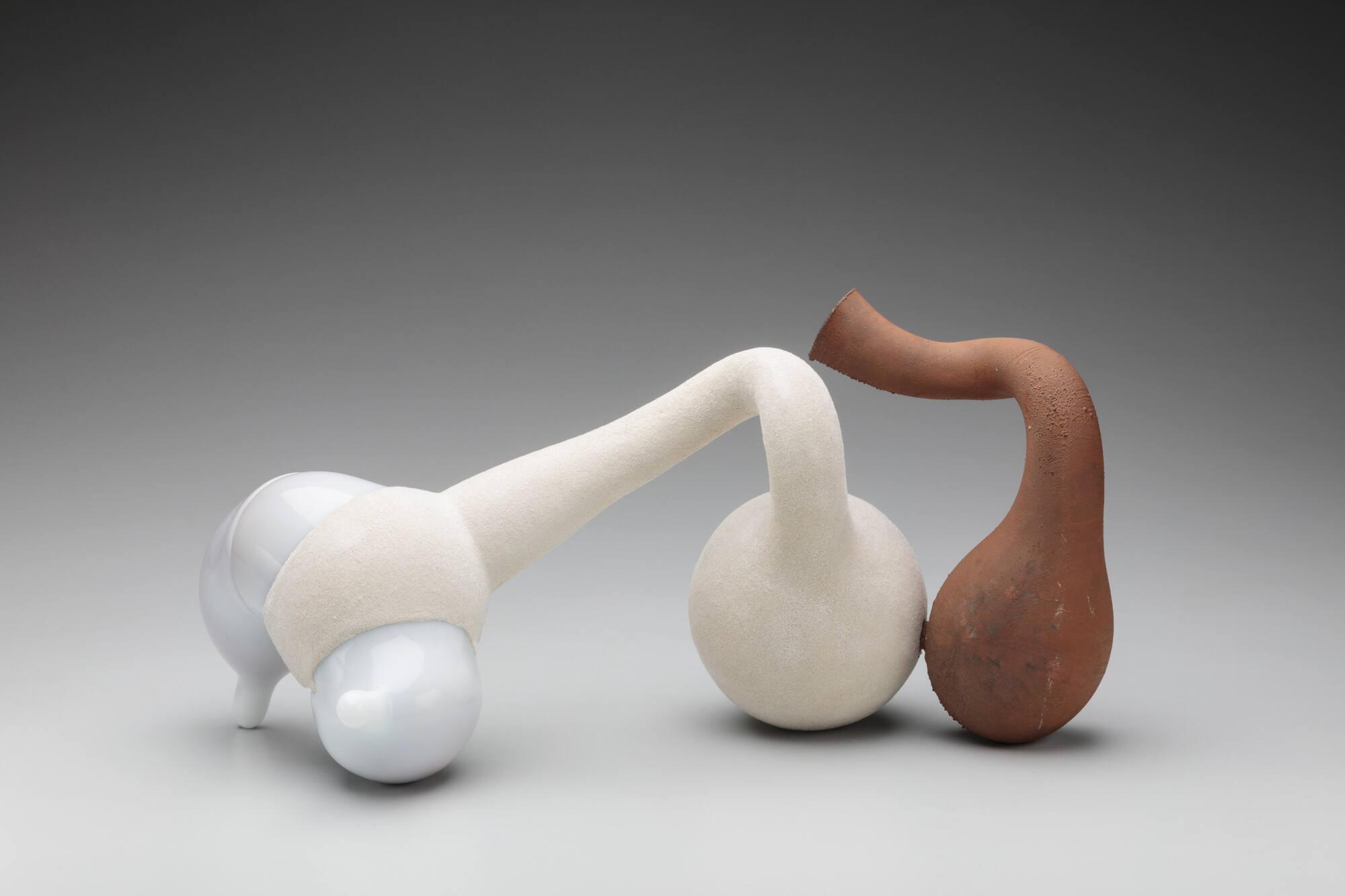DescriptionAbstract, organic glass sculpture with white flocking. The glass is a milky, opaque white, with a rounded base and a long, stretched, curved component. Touching the white flocking is a second curved, organic component in matte, copper plating. The gourd-like shape ends in a thin tube at the top of the work.