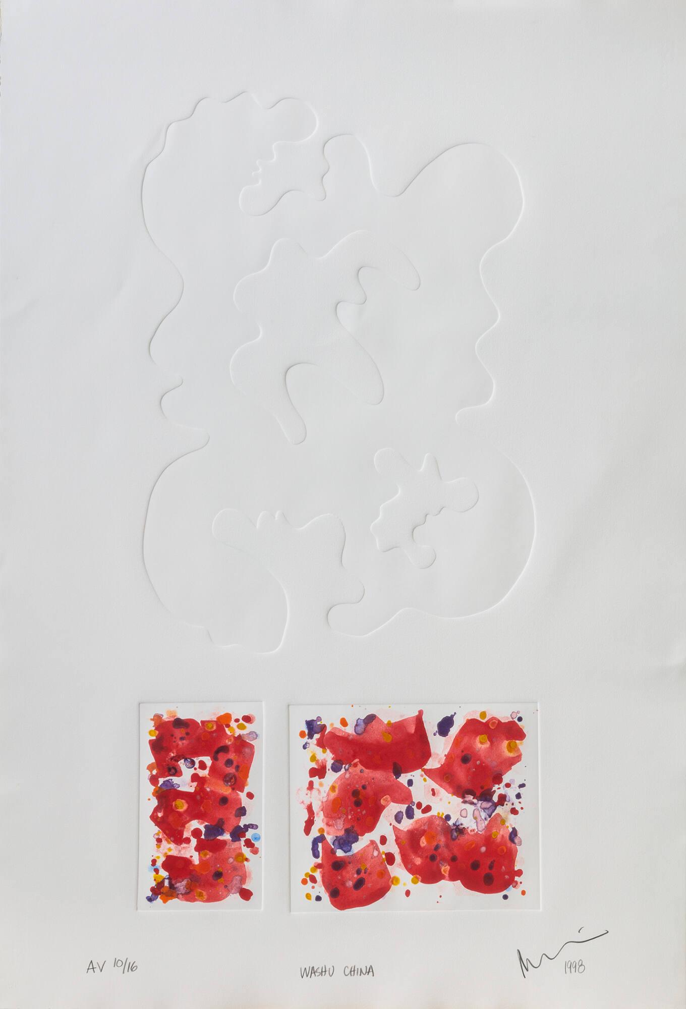 DescriptionWhite print in portrait orientation. Centered in the top 2/3 of the paper is an organic curved shape in an embossed monoprint. Below the shape are two embossed blocks, the left a vertical rectangle, the right a thick square. In the two embossed blocks are abstract painted strokes in a rich orange-red, with speckles of yellow, blue, red, and white.