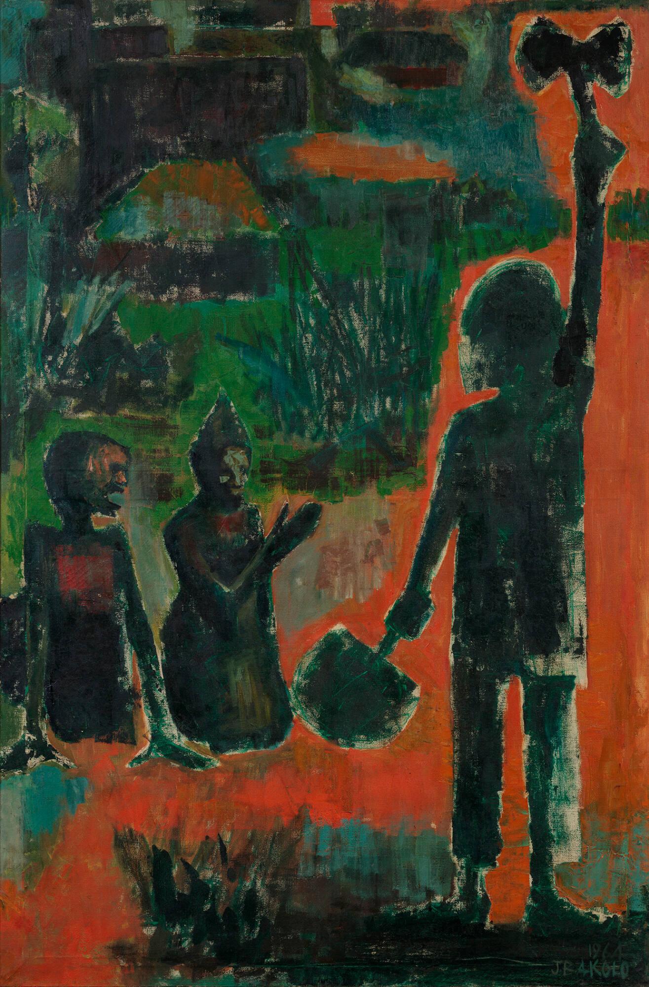 DescriptionTwo female figures kneeling before a towering male figure with a tools in each hand. The subjects are set against a vibrant back drop of lush green forest land and vibrant red earth.