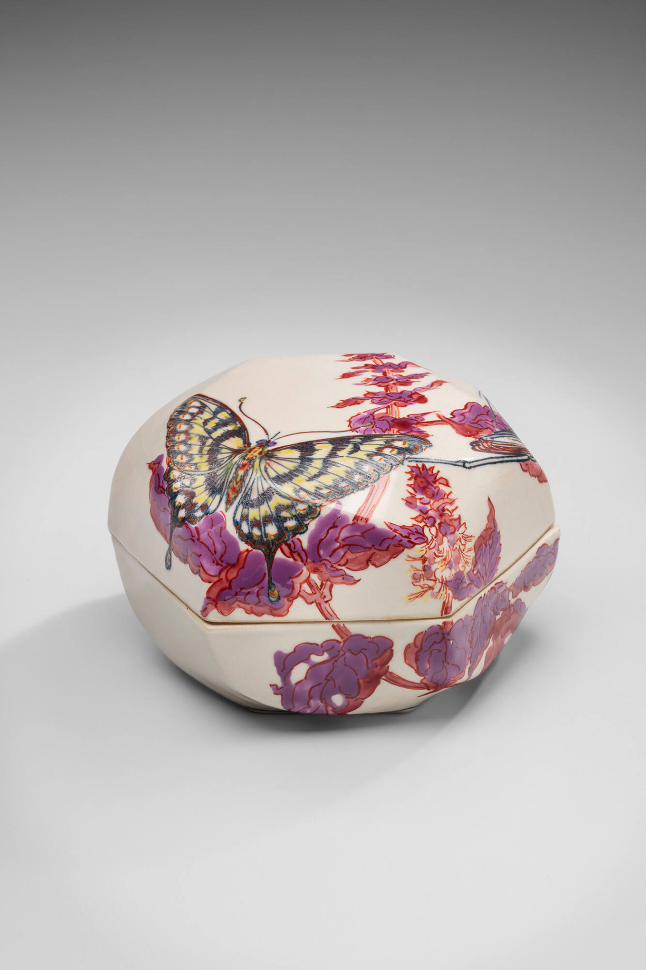 DescriptionA hexagonal lidded box made of porcelain with surface decoration. The surface decoration shows a praying mantis and a