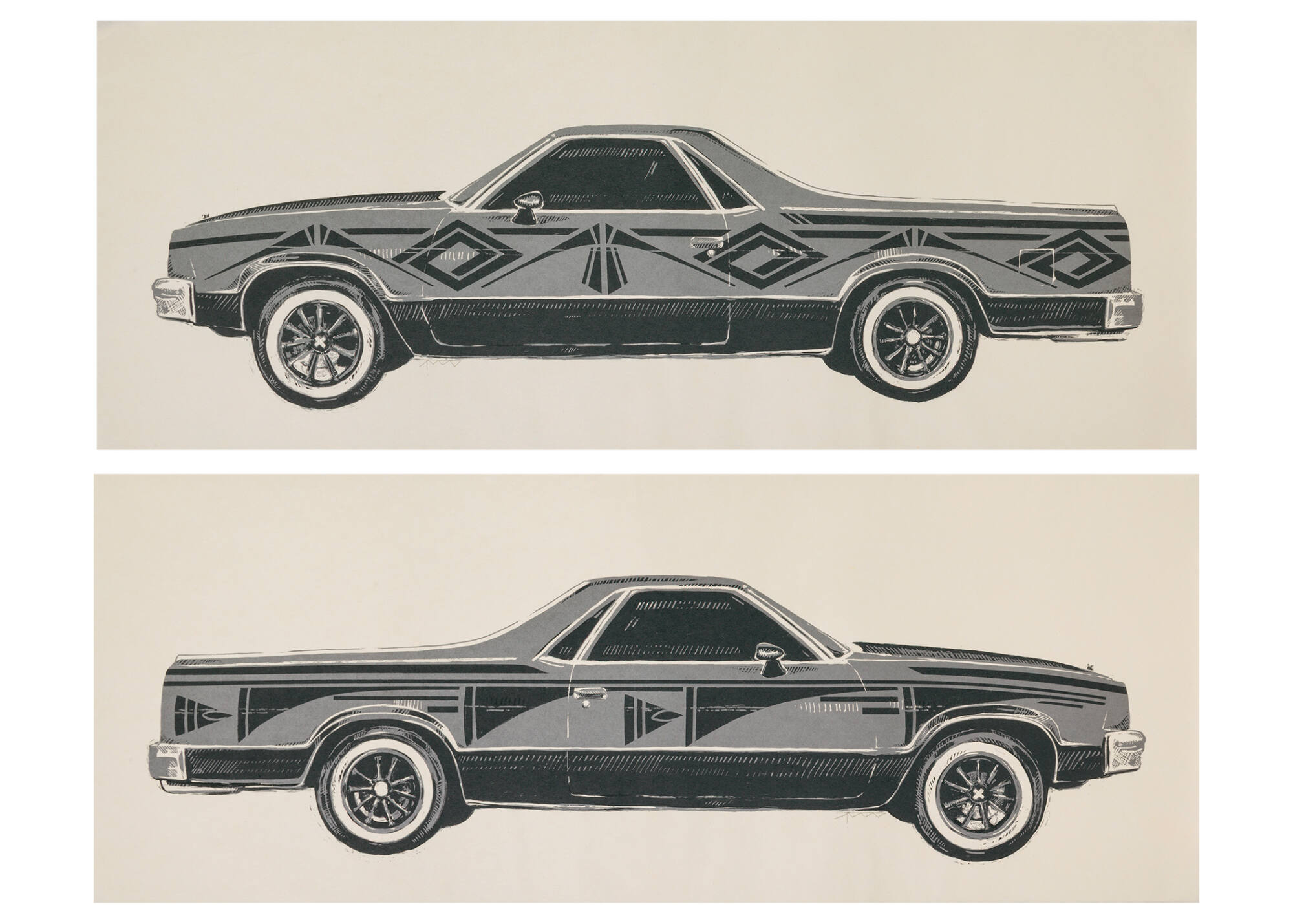 DescriptionTwo-color lithograph diptych. Each print (18 x 48 inches) depicts one