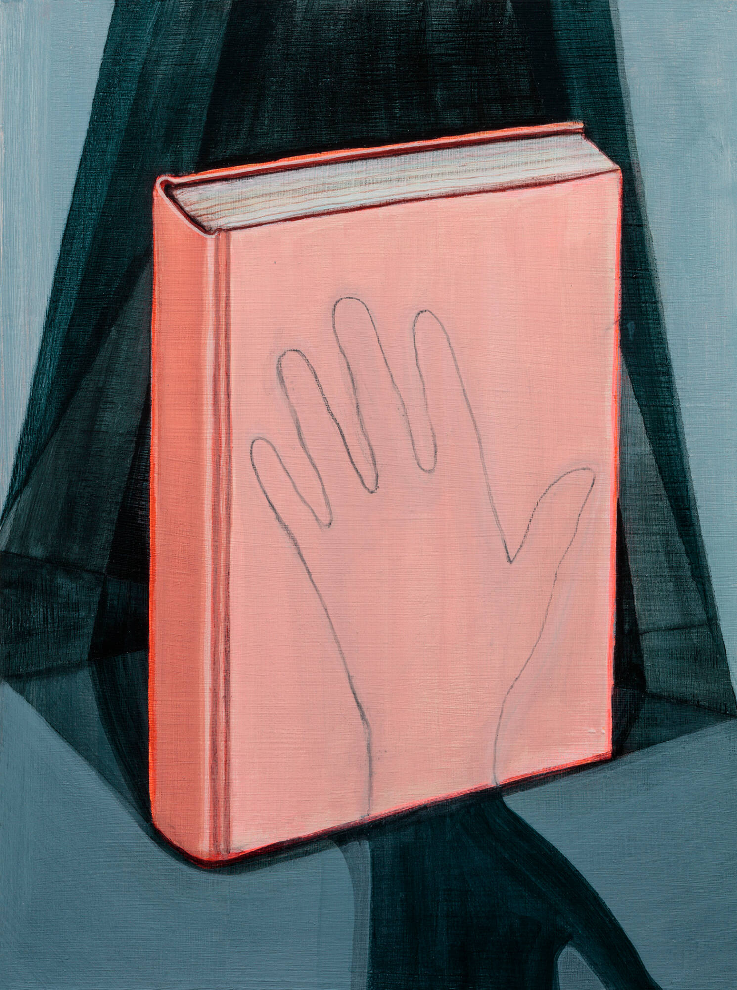 Descriptiona closed book with a muted coral cover, subtly outlined in red