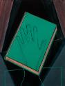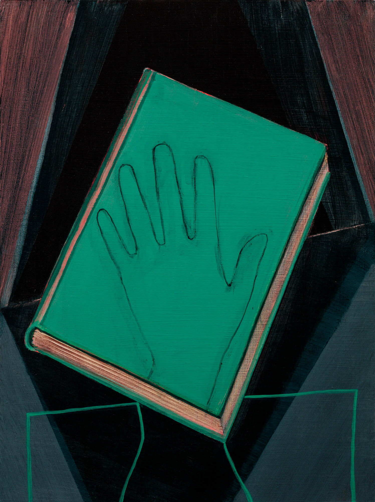 Descriptionpainting of a green book tilted precariously with an outlined handprint overlaying the book's cover