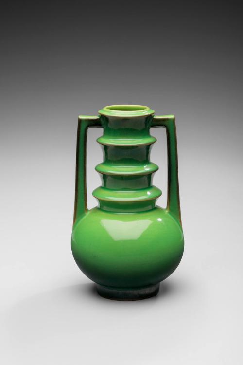 DescriptionA green urn with a large, rounded base. The center of the vase has four
