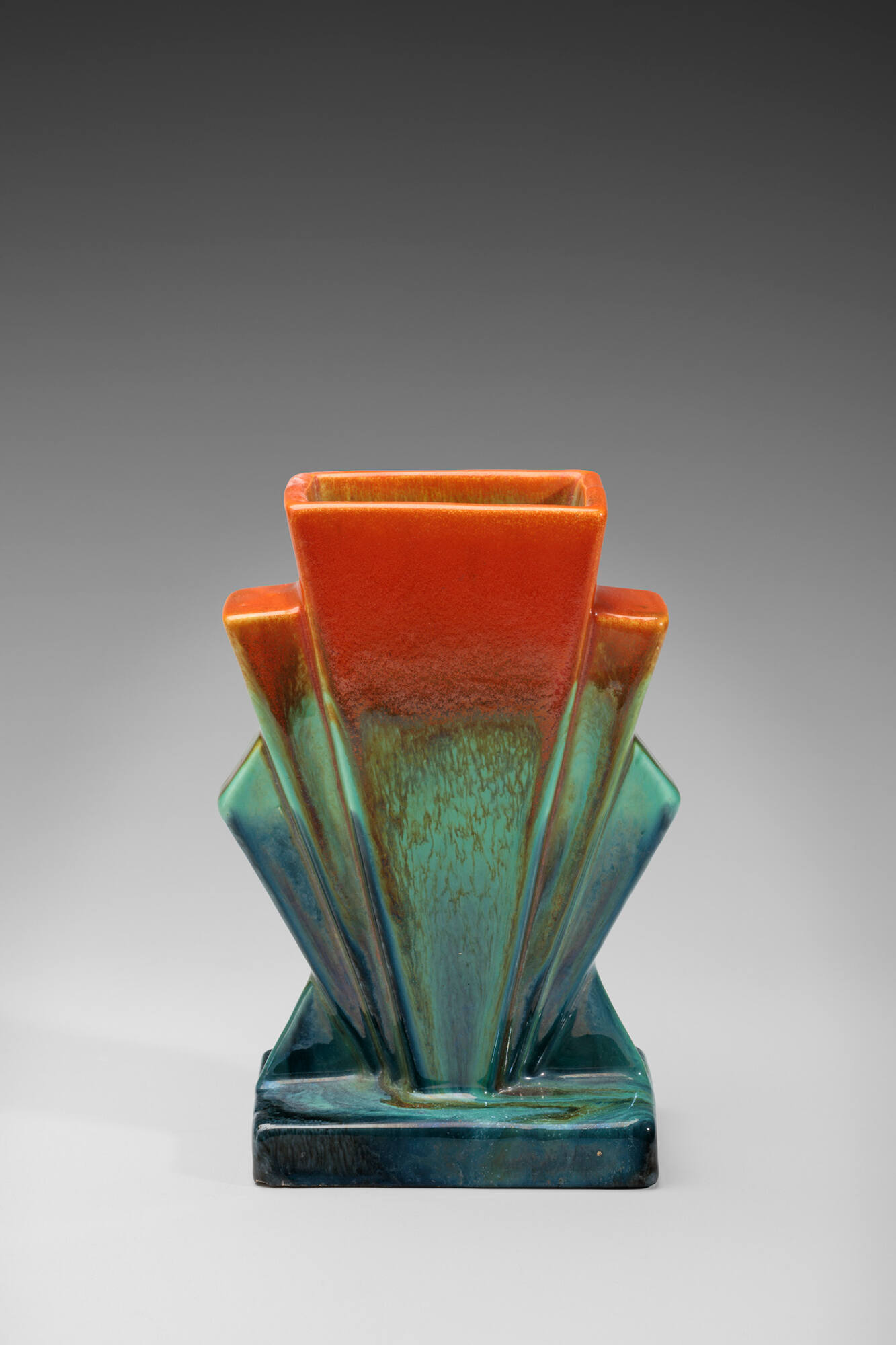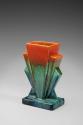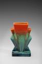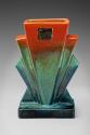 DescriptionA three tiered vase with sharp, architectural flares building from the base. The rectangular base is a dark near black, which transitions into a blue and blue-green glaze. The majority of the vase is in this green and blue-green glaze, with the top third of the work transitioning into a vivid orange.