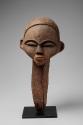DescriptionA carved wooden head with elongated neck, mounted on a black rectangular base. The face is triangular with a pointed chin, prominent cheekbones, and slightly pursed lips. The eyes are narrow and almondshaped, set beneath heavy, arched brows. The forehead is high and rounded, marked by a carved line suggesting a headband or hairline, while the ears protrude slightly from the sides of the head. The surface shows areas of wear and abrasion, with lighter patches where the wood has been exposed. Vertical cracks run along the neck, emphasizing the aged quality of the sculpture.