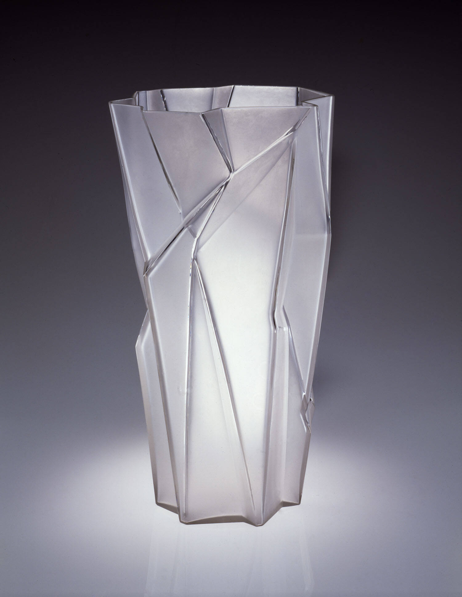 Haley experienced Cubism first-hand at the 1925 Paris Exposition Internationale des Arts Décoratifs et Industriels Modernes and immediately adapted the faceted and fractured sensibility to his designs that were being sold in American department stores to a middle-class audience. A 1928 advertisement tells us that Haley took the name “Ruba Rombic” from ruba’i, a Persian poetry genre and rhombic from the world of geometry, meaning an irregular shape with no right angles. Together the name implies something refined and expressionistic even though the wares were mass produced. The line for glassware was premiered by Consolidated Lamp and Glass Co. (Coraopolis, PA, previously, Fostoria, OH) in 1928 at a glass fair in Pittsburgh and was declared, “an absolutely cubist creation” (see TMA 1993.6). A sensational seven-page advertising spread promoting “Ruba Rombic, An Epic in Modern Art,” was published in the February 1928 issue of The Gift and Art Shop. The dramatic images even included the oddly shaped shadows cast by various forms, as if to flaunt their irregularity. Another advertisement had a jagged outline, mimicking the lines of the glass.
